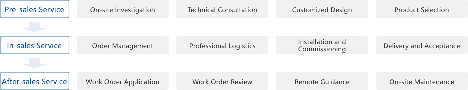 During the contract-specified warranty period, in the event of equipment or engineering quality issues found during unpacking inspection, installation, commissioning and trial operation, we provide free three-guarantee services: repair, replacement and return until the products meet quality requirements.
